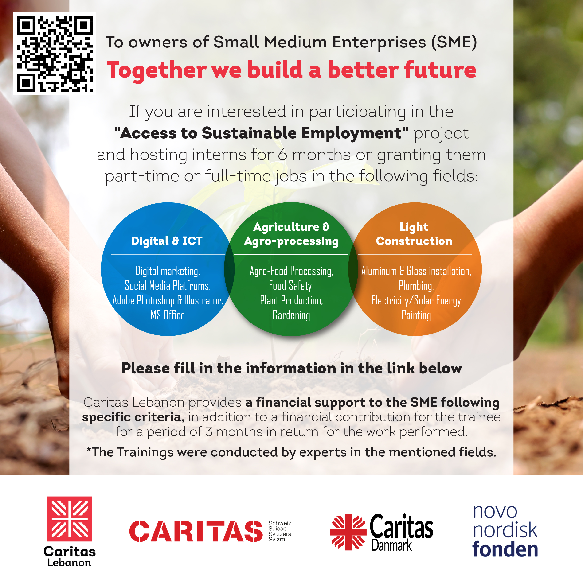 ضمن برنامج “التدريب من اجل التوظيف” المموّل من مؤسسة نوفونورديسك بالتعاون مع كاريتاس سويسرا وكاريتاس الدنمارك، تمنح كاريتاس لبنان أصحاب المؤسسات الصغيرة والمتوسطة فرصة للمشاركة في بناء غد أفضل. إذا كنت صاحب مؤسسة صغيرة أو متوسطة الحجم ضمن محافظات البقاع, بيروت أو جبل لبنان وترغب في : توظيف شبان وشابات مدّربين في مجال تكنولوجيا المعلوماتية والاتصالات، الزراعة والتصنيع الزراعي أو البناء ,الحصول على مساهمة مالية للمتدرب لقاء عمله لمدة 3 أشهر وتلقّي دعم مالي لمؤسستك (وفقًا لمعايير محددة).