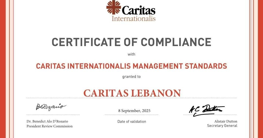 نالت رابطة كاريتاس لبنان رسميًا شهادة الامتثال لمعايير الإدارة (CIMS – Caritas Internationalis Management Standards) الصادرة عن كاريتاس الدولية في الفاتيكان بتاريخ 8 أيلول 2025. وقد اتت هذه…