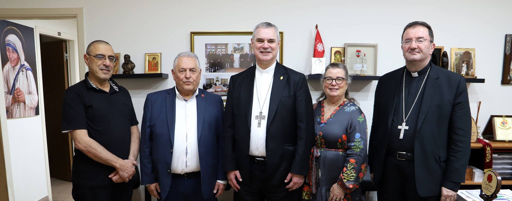 The Maronite Bishop of Australia, Bishop Antoine-Charbel Tarabay, accompanied by the Archbishop of Melbourne Peter Andrew Comensoli and the Chancellor of the Catholic Archdiocese of Melbourne Annie Carrett, were welcomed by Caritas Lebanon Vice-President Dr. Nicolas El Hajjar, the Executive Director Gilbert Zouein, in the presence of Caritas Lebanon directors at the Headquarters SinElFil, where they reviewed and discussed the history, activities, programs, and challenges of Caritas, exploring ways for future cooperation. The discussion included Caritas’ role during the 2019 economic crisis and the Beirut Port explosion, highlighting Caritas’ efforts in relief and rehousing displaced citizens whose homes were destroyed. They also discussed ways to support Caritas’ mission to alleviate the difficulties of the Lebanese people.